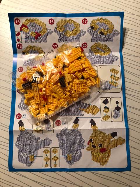 Perfect : the package arrived quite quickly, well protected under bubble letter. => Block mounting isn't that simple for children (7years old) ... => Some mounting step are quite hard to follow, when 3D view of the model, show differents disconnected blocks groups (typically : the leafs of this Pokémon) => For the mounting time : 1h for 100 blocks