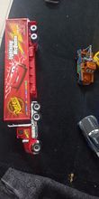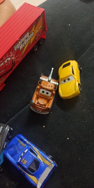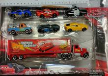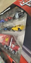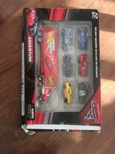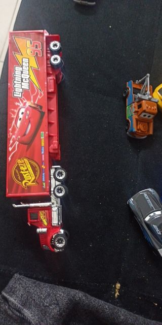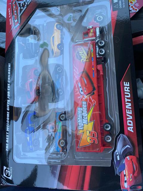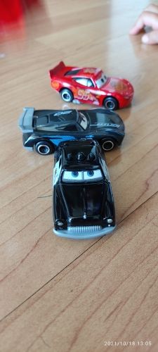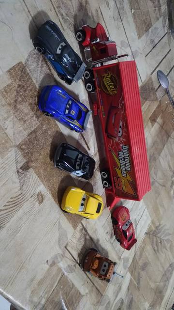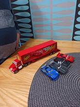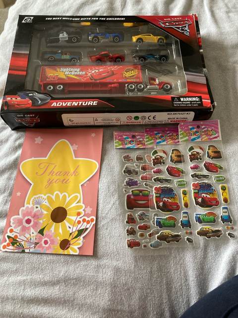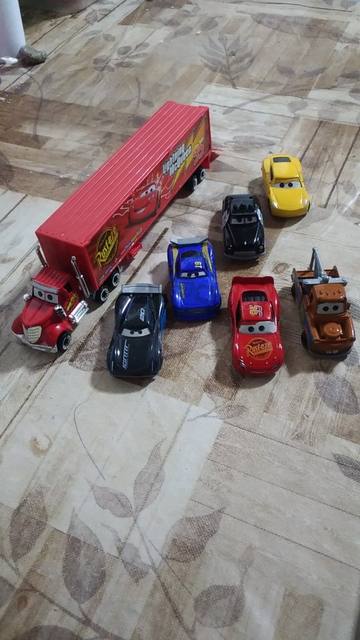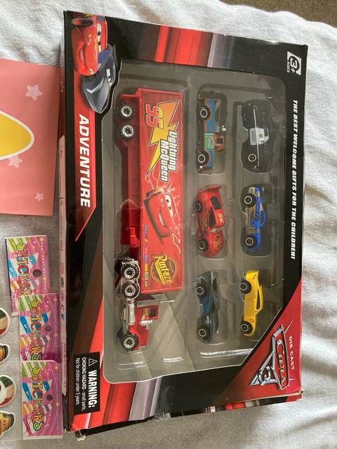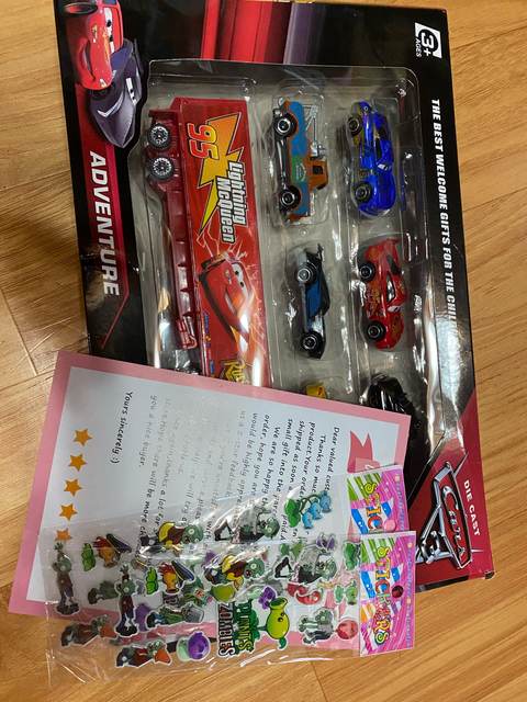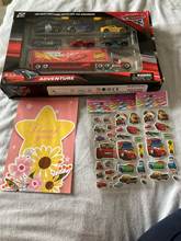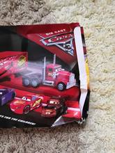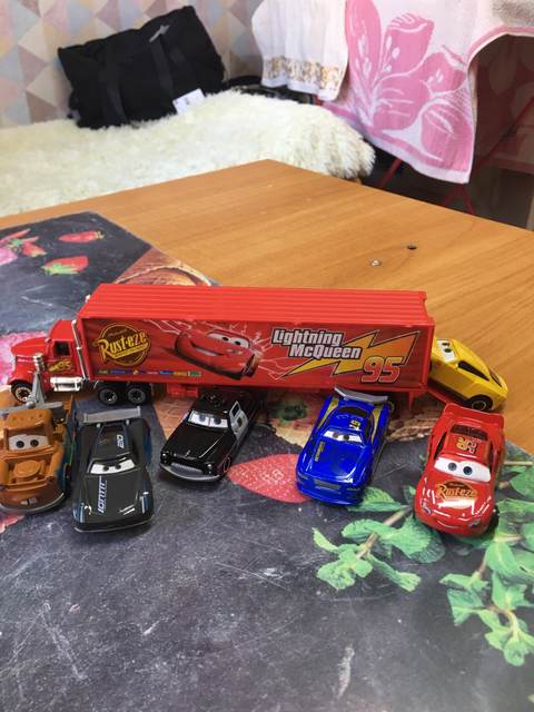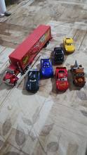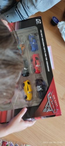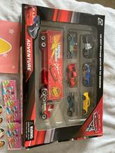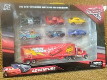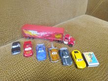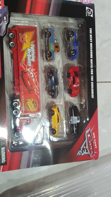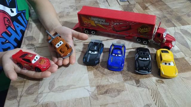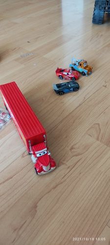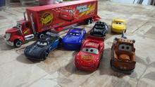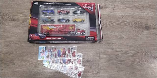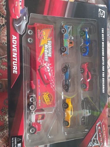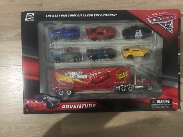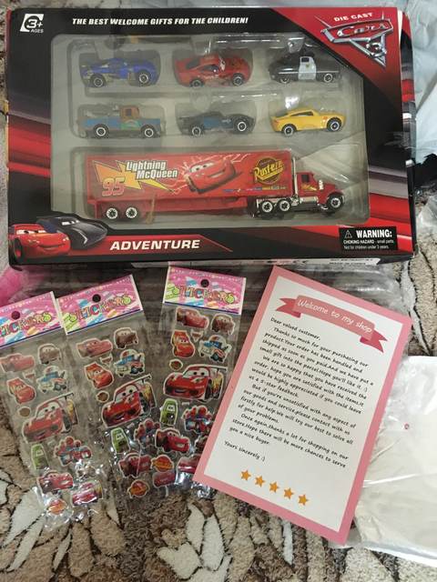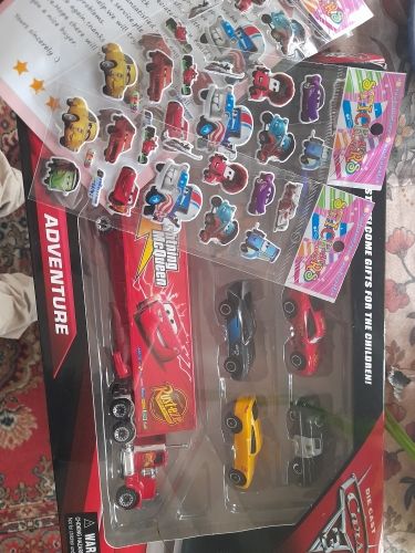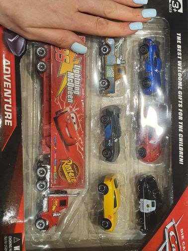 Товар получил в Украине спустя 3 недели после заказа. Посылка хорошо упакована, но коробка все равно была немного примята, при этом сами машинки не пострадали. Все машинки сверху металлические, низ пластмассовый, трейлер у Мака тоже пластмассовый. По размеру машинки сопоставимы с игрушками серии HotWheels, чем были приятно удивлены (по другим отзывам ожидали что будут меньше). Все рисунки нанесены краской, кроме глаз (они наклеены). Машинки в трейлер входят немного туго, помещается две одновременно. В посылку продавец положил в подарок 3 комплекта небольших наклеек и открытку с благодарностью. Ребенок набором очень доволен. С учётом скорости доставки и удовлетворительного качества товара могу рекомендовать к покупке.