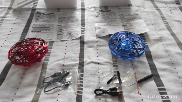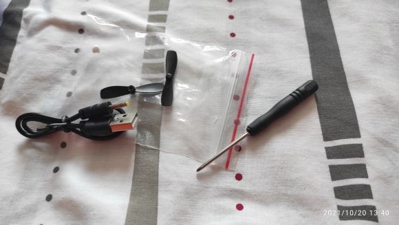 As the description, it brings 2 additional propellers and screwdriver, size like the palm of the hand, light, battery lasts about 5 minutes of use and needs to be recharged. Satisfied girls!