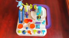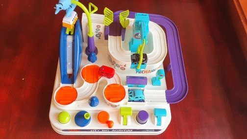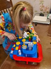 очень приятная игрушка, в комплекте 4 машинки, всё работает, легко собрать, приятный пластик, без запаха. чуть бы побольше размер, но это копия, всё понятно.